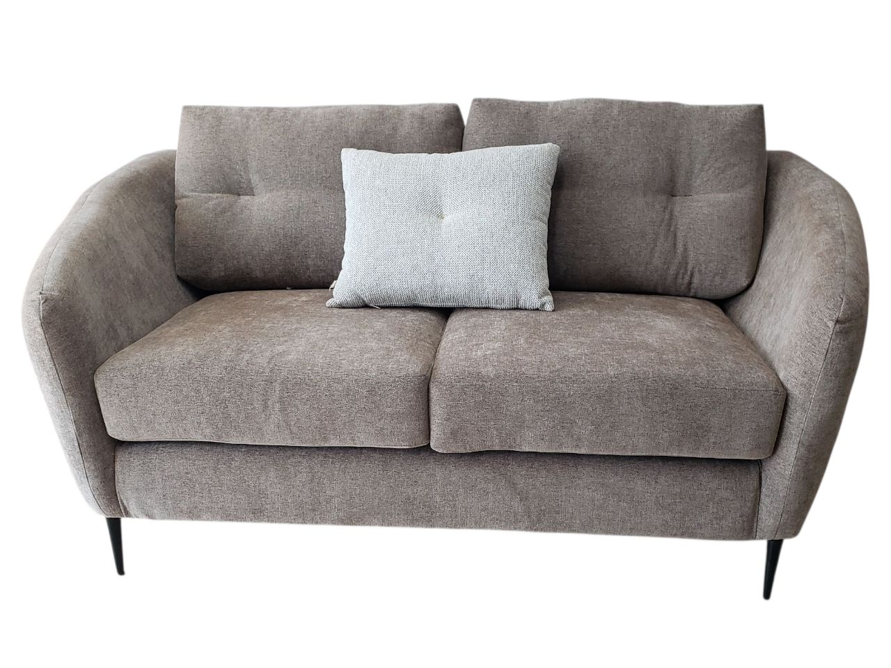 El tapizado en un elegante y suave tono moca resalta la textura de la tela, mientras que sus patas delgadas de metal le dan un toque ligero y minimalista. Los cojines de respaldo con botones decorativos y los cojines de acento en contraste crean un conjunto armonioso y visualmente atractivo. Es el mueble ideal para quienes buscan comodidad sin sacrificar el estilo en su sala de estar.